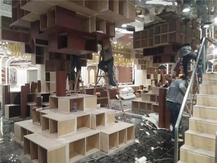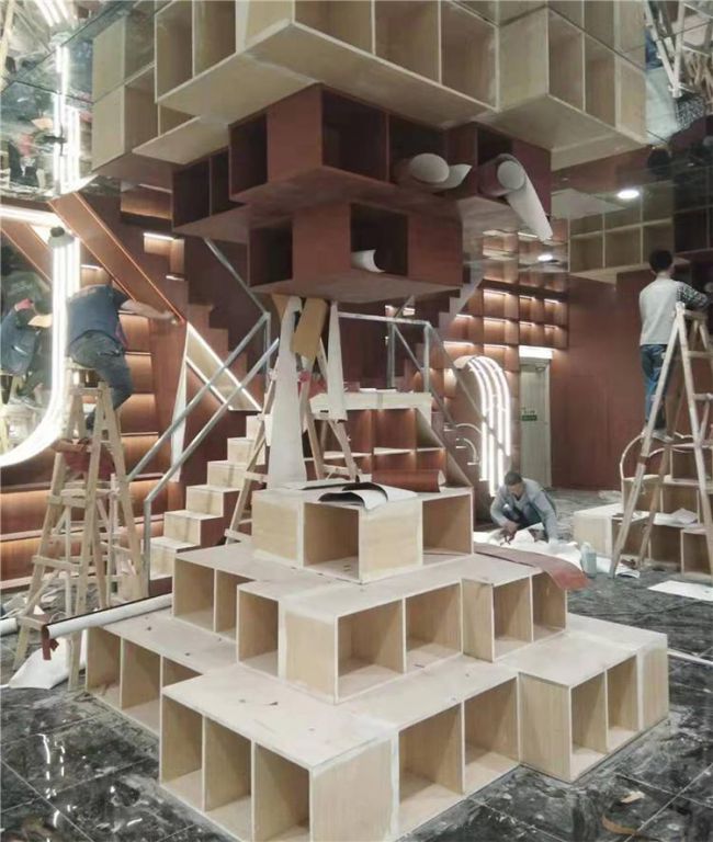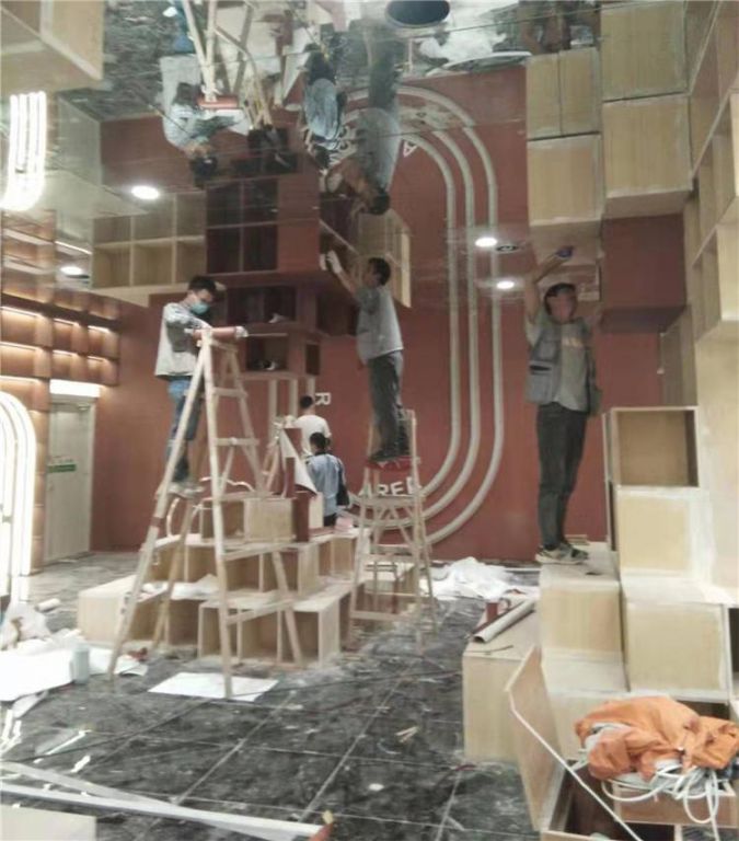 做這種造型設(shè)計最重要的就是一定要將邊角的部分壓實,否則空氣進入導(dǎo)致空鼓或者木紋膜脫落都會影響建筑整體的美觀性,所以前期的準備工作也是很重要的。