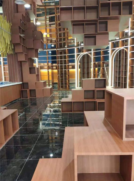 書店、展廳、店鋪如果要做出這種多格子的建筑設(shè)計,最能體現(xiàn)環(huán)境氛圍的就是用木紋紙覆蓋建筑表面,達到色彩統(tǒng)一、質(zhì)感高級的視覺效果。